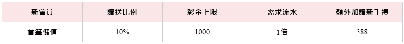凡新會員首次儲值即可申請10%回饋外,額外加送新手禮金388,只需一倍流水即可託售。