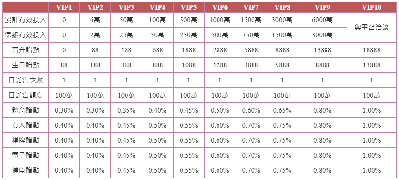 晉升標準:會員的累計點數轉入量以及累計遊戲量達到相應級別的要求,即可在次日24點前晉級相應VIP等級, 晉升彩點由系統依序發放。